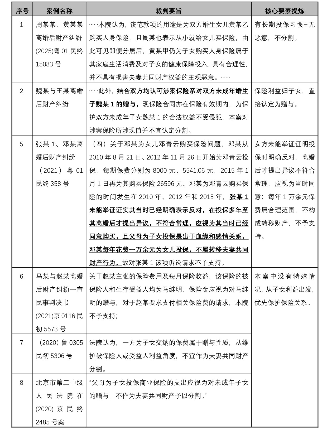 4.保险利益的归属:若保险合同明确约定被保险人、受益人为子女(尤其是未成年子女),且保险类型为保障型(非理财型),法院优先保护子女的保险利益,不支持分割;若保险为理财型,且投保人可随意提取现金价值,则可能被认定为“以子女名义持有夫妻共同财产”。