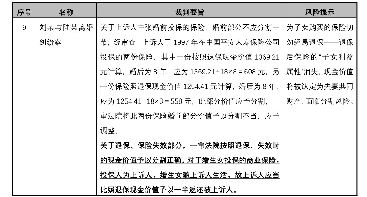 5.是否有退保行为:退保行为是改变保险财产属性的关键节点,一旦保险购买人(通常为父母一方)主动办理退保,原保险合同项下的“子女专属保险利益”将因合同终止而灭失,取而代之的是可直接支配的“现金价值”(即退保后保险公司返还的剩余财产利益)。此时,该现金价值的法律属性将发生根本转变,若无特殊例外情形,应当纳入夫妻共同财产的范畴予以分割。